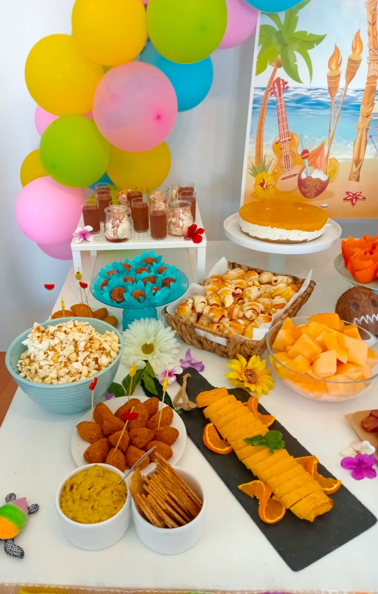 Como as crianças gostam de usufruir da piscina, não foi necessário pensar em atividades para os entreter, mas se precisar de sugestões pense numa aula de dança havaiana, como o hula, por exemplo. Outra ideia é organizar jogos típicos de praia, como voleibol ou corrida de sacos. Ou uma sessão de pintura facial com motivos tropicais.