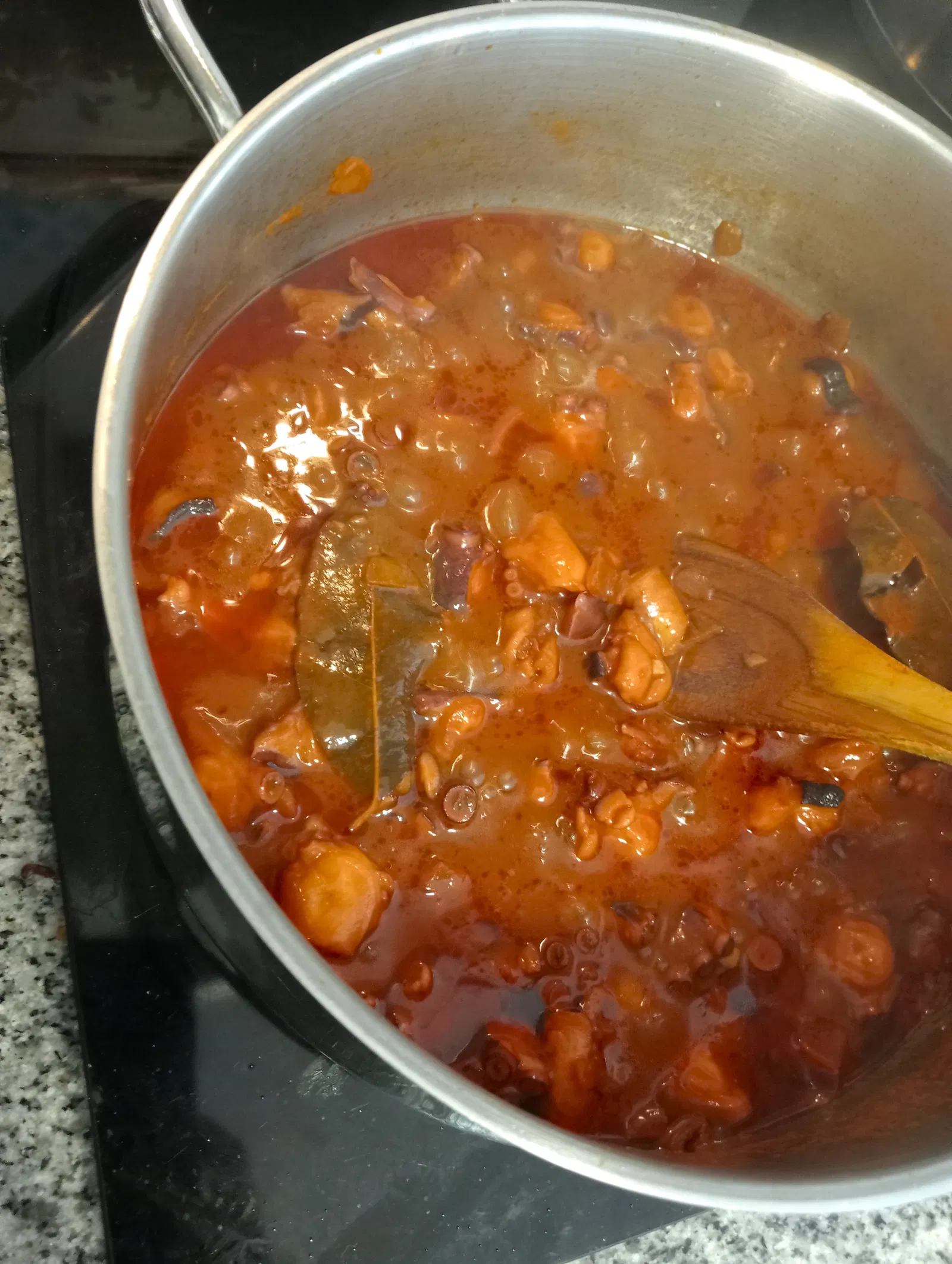 Envolva os pedaços de polvo neste molho e deixe cozinhar até estar tenro (aproximadamente 30 minutos).